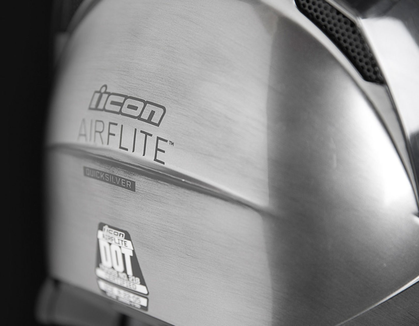 The newest addition to the lineage received the full-on race treatment. This unique finish is accomplished by applying silver paint to the shell then painstakingly antiquing each helmet by hand. This unique finish of the Icon Airflite Quicksilver Helmet is.